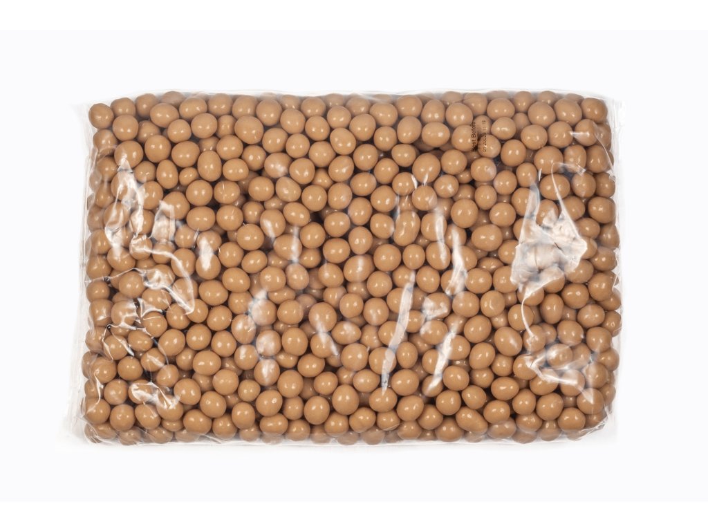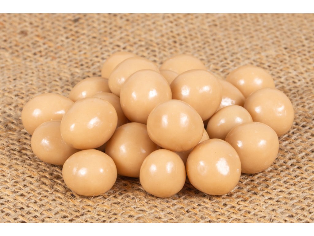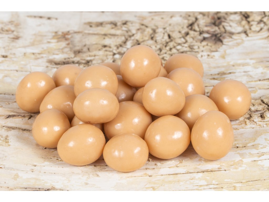 Složení : Cukr, *LÍSKOVÁ JÁDRA 33%, rostlinný tuk (palmový), *SYROVÁTKA, rýžová mouka, carobová mouka, emulgátor: slunečnicový lecitin E322, leštidlo: arabská guma, šelak E904, karamelové barvivo E150a, karamelová příchuť.